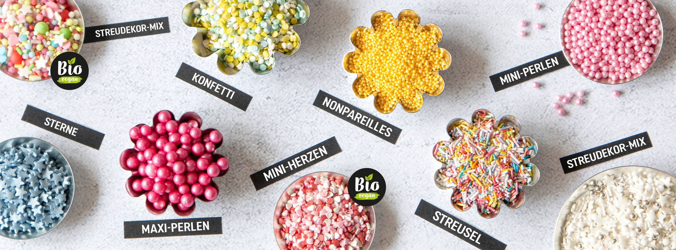 Darf’s ein bisschen mehr sein? Unsere Auswahl an Dekorzucker ist riesig. Sehen Sie sich einfach einmal in der Kategorie "Streudekor" um!