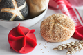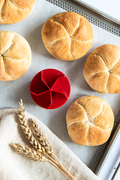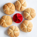 Für das typische Muster den Teig zu Kugeln formen, etwas flach drücken und den Brötchenstempel in den Teigling drücken. Nach der Gehzeit die Brötchen wie gewohnt backen. So verleihen Sie Ihren selbstgemachten Brötchen die typische Kaisersemmel-Optik wie aus der Bäckerei.