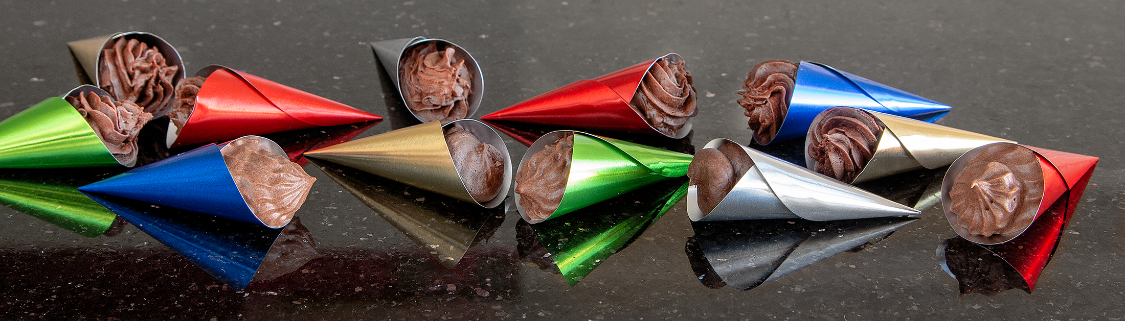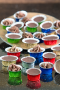 Mit diesen farbenfrohen Pralinenkapseln aus Aluminium krönen Sie Ihre eigenen Pralinen. Ihre Pralinenmasse einfach mit einer Loch- oder Sterntülle in die Kapseln einfüllen.