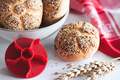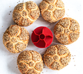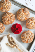Für das typische Muster den Teig zu Kugeln formen, etwas flach drücken und den Brötchenstempel in den Teigling drücken. Nach Belieben mit Salz und Kümmel bestreuen und nach der Gehzeit die Brötchen wie gewohnt backen. So verleihen Sie Ihren selbstgemachten Brötchen die typische Salzsemmel-Optik wie aus der Bäckerei.