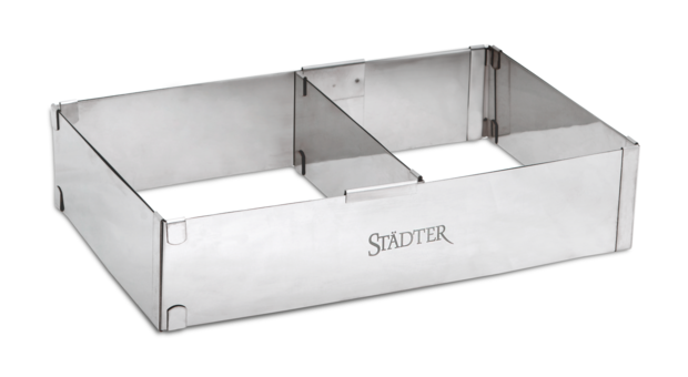 Den Backrahmen auf ein mit Dauer-Backtrennfolie belegtes Herdbackblech stellen und die Schokomasse in eine Hälfte und die helle Masse in die andere Hälfte des Rahmens füllen. Im vorgeheizten Ofen bei 190 °C Ober-/Unterhitze oder 170 °C Umluft für ca. 10 Minuten backen. Aus dem Ofen nehmen und abkühlen lassen.